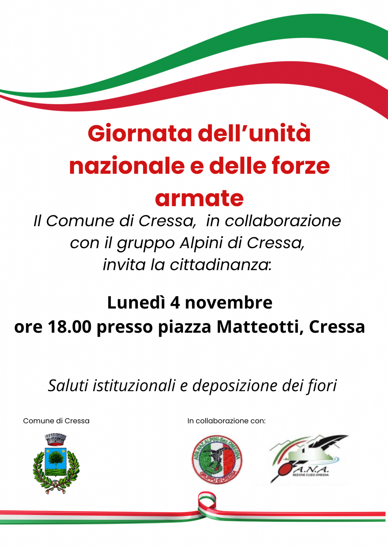 L'Amministrazione Comunale invita la Cittadinanza Lunedì 4 Novembre alle ore 18 presso la Piazza Matteotti, davanti al Monumento dei Caduti, per la Cerimonia di Commemorazione, organizzata con la collaborazione del Gruppo Alpini di Cressa.