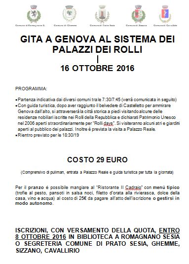 ISCRIZIONI, CON VERSAMENTO DELLA QUOTA, ENTRO 8 OTTOBRE 2016 IN BIBLIOTECA A ROMAGNANO SESIA O SEGRETERIA COMUNE DI PRATO SESIA, GHEMME, SIZZANO, CAVALLIRIO