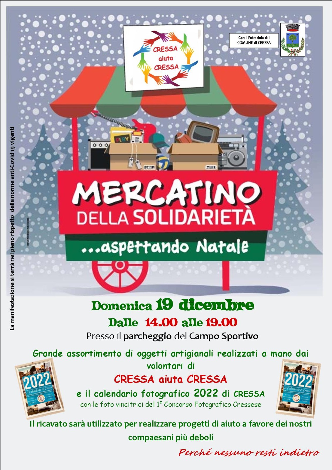 Domenica 19 Dicembre 2021 dalle ore 14.00 alle ore 19.00 presso il parcheggio del centro sportivo di Via Martiri "Mercatino della solidarietà", dove si può trovare un vasto assortimento di oggetti artigianali realizzati a mano dal gruppo di volontari dell'Associazione Cressa aiuta Cressa.