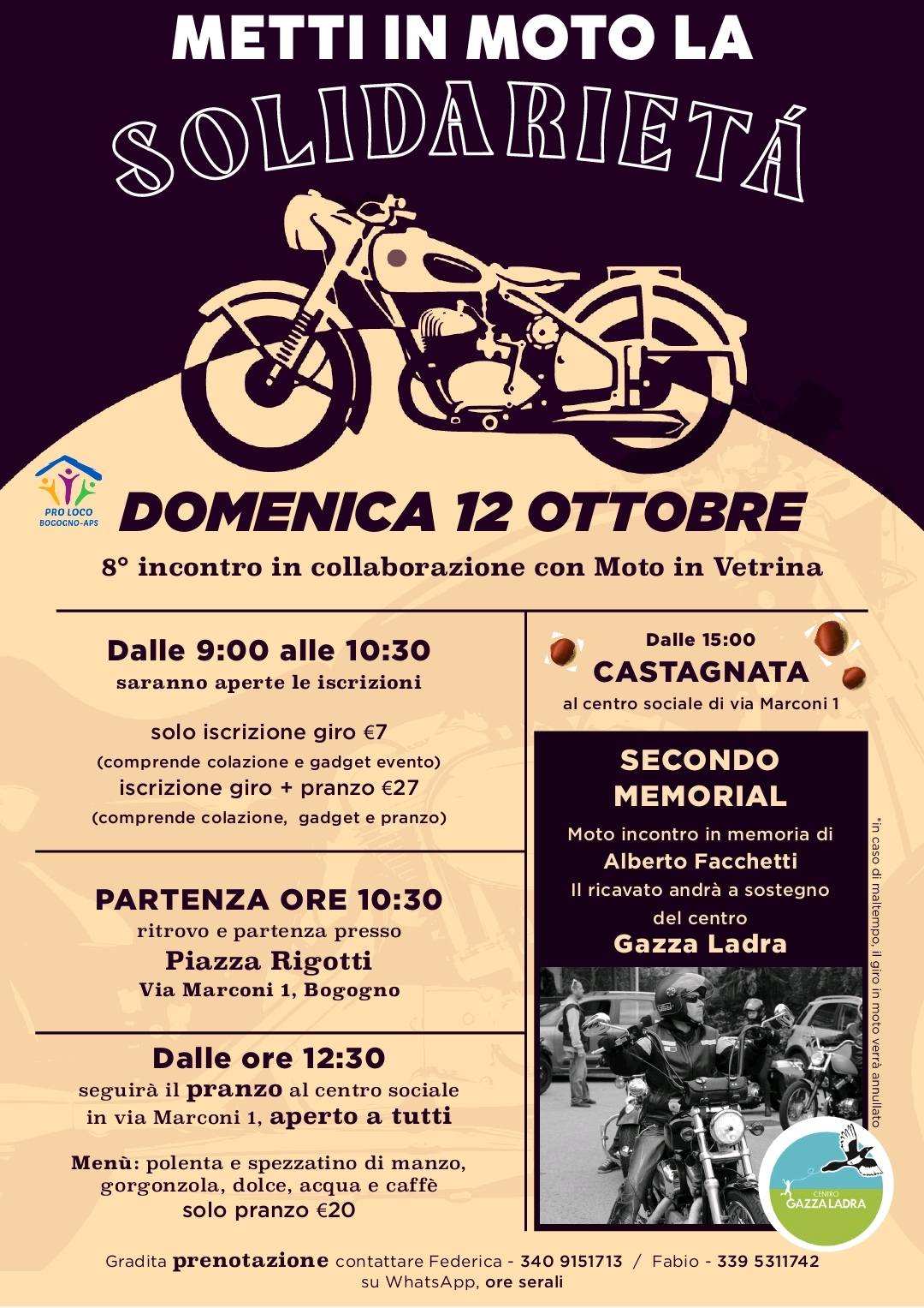 Domenica 12 Ottobre evento benefico organizzato dalla Pro Loco di Bogogno “Metti in moto la solidarietà” a sostegno del centro Gazza Ladra: moto incontro in memoria di Alberto Facchetti con ritrovo e partenza alle ore 10.30 da Piazza Rigotti, seguito dal pranzo sotto al tendone del centro sociale dalle ore 12.00.