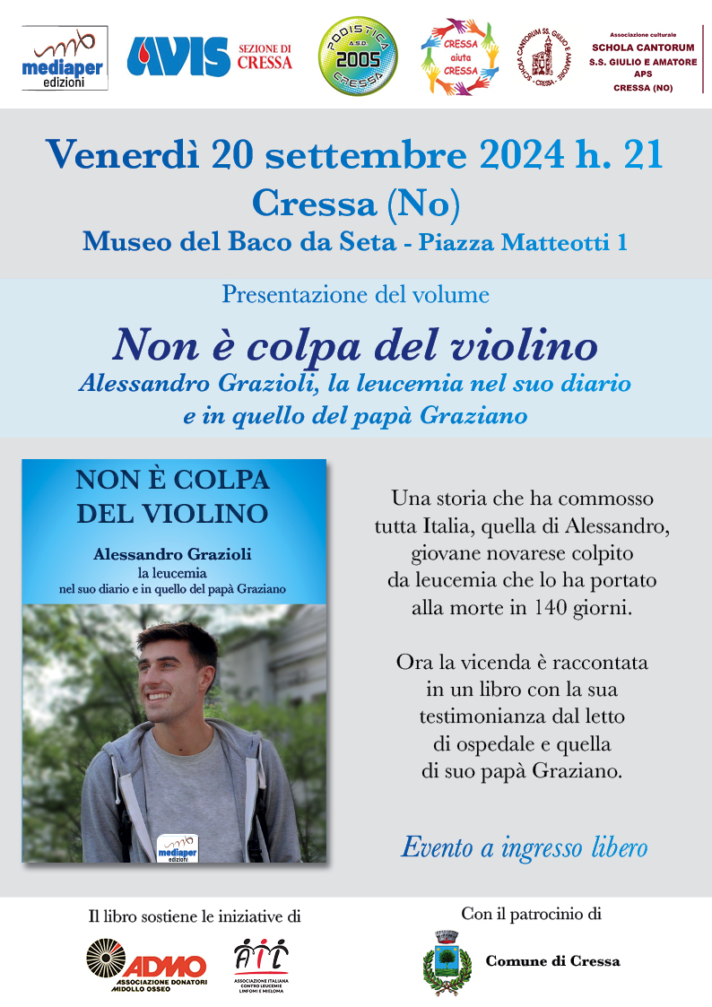 Presso il Museo del Baco da Seta, Venerdì 20 Settembre 2024, alle ore 21.00, ci sarà la presentazione del volume: "Non è colpa del violino" la storia di Alessandro Grazioli colpito dalla leucemia, raccontata attraverso il suo diario e in quello del papà Graziano.