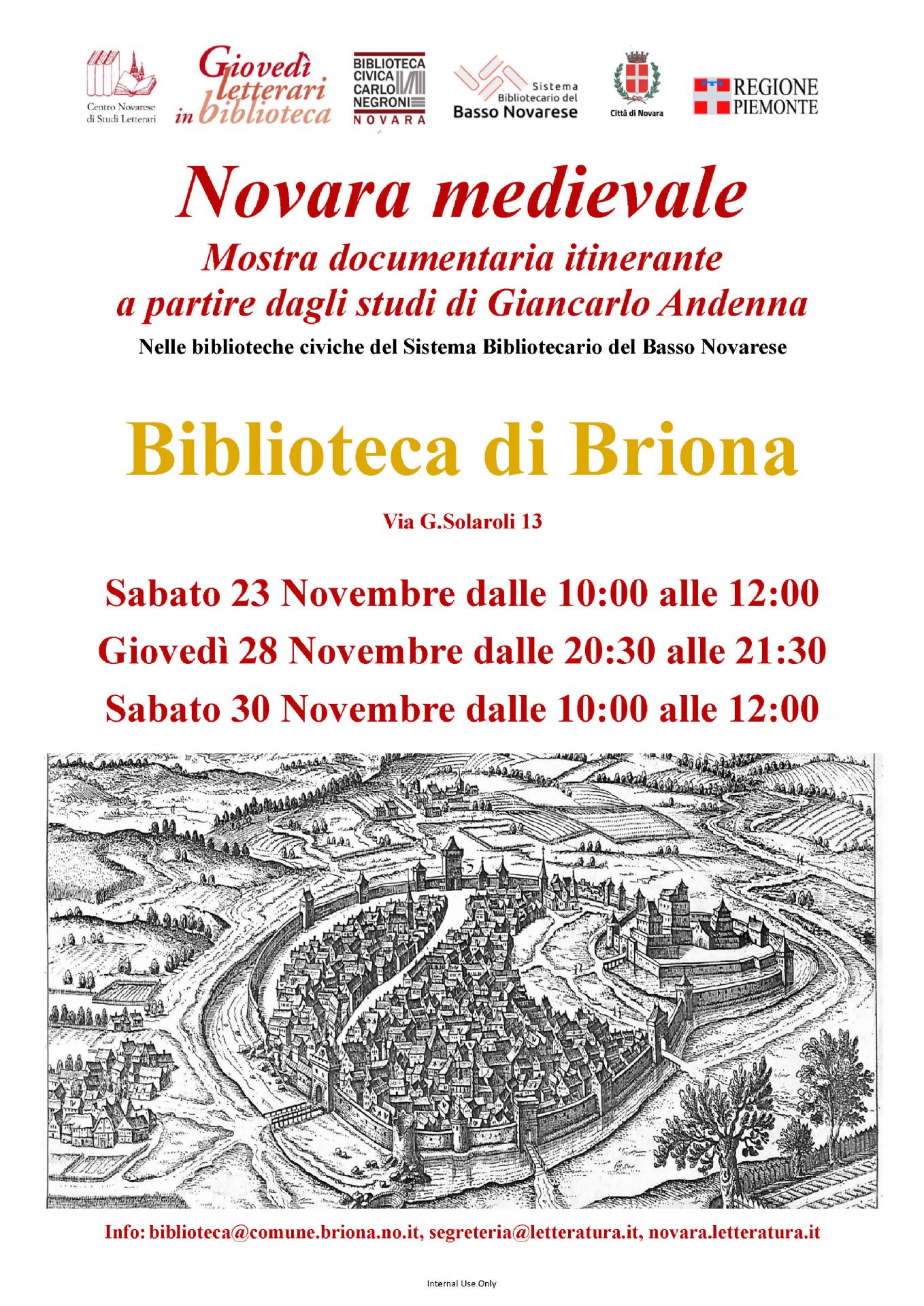 Anche nella Biblioteca di Briona “Giancarlo Tornaco” nei prossimi giorni potrete trovare la mostra "Novara medievale", una mostra documentaria itinerante a partire dagli studi di Giancarlo Andenna. Organizzata dal Sistema Bibliotecario Basso Novarese, con il Centro Novarese di Studi Letterari e la Biblioteca Civica Carlo Negroni Novara, la mostra sarà visitabile sabato 23 novembre dalle 10 alle 12, giovedì 28 novembre dalle 20.30 alle 21.30 e sabato 30 novembre dalle 10 alle 12.