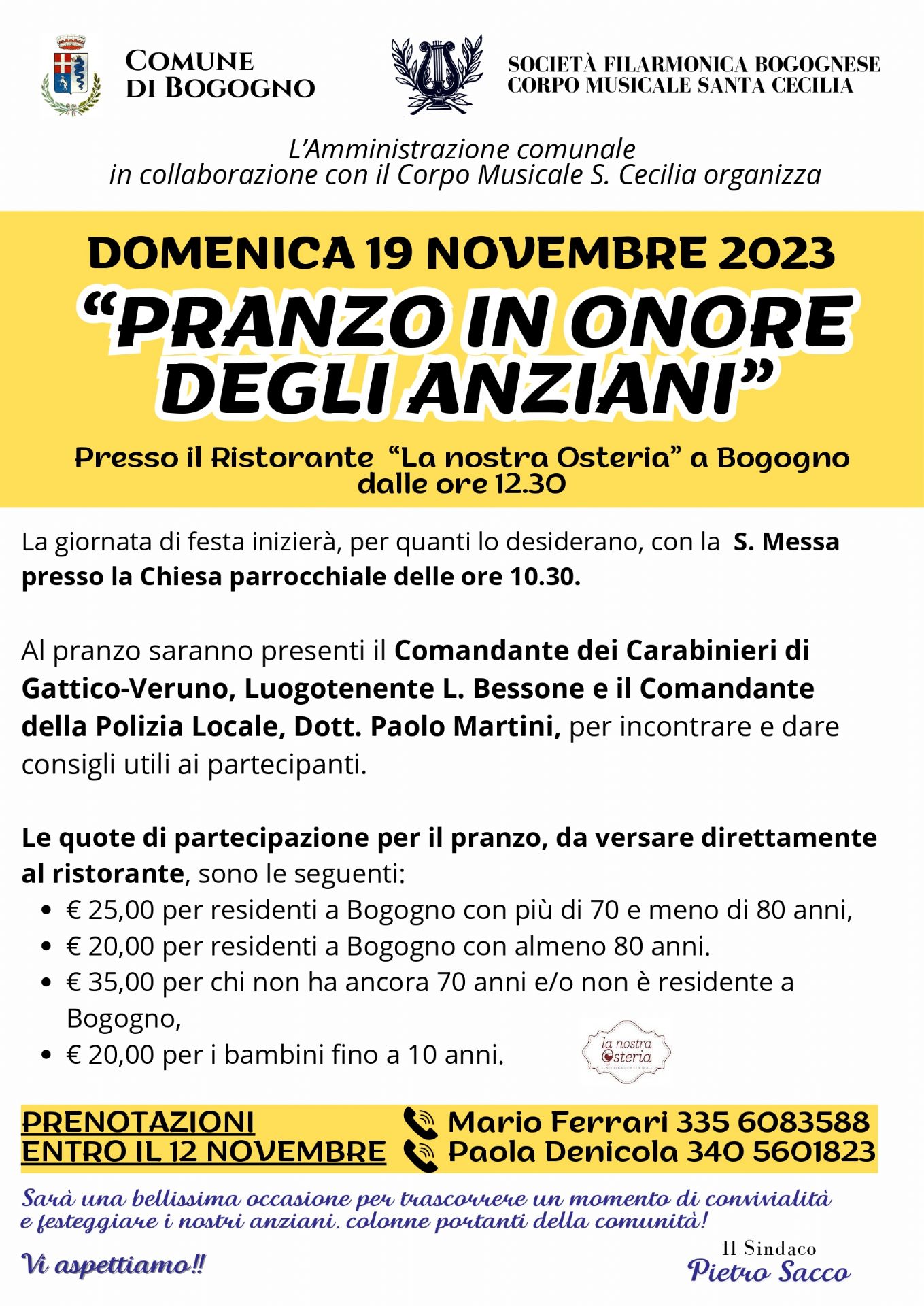 “Pranzo in onore degli anziani”, domenica,19 novembre 2023, alle ore 12.30, presso il ristorante “La nostra Osteria” di Bogogno.