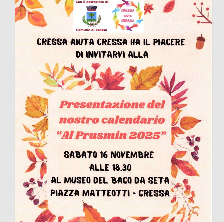 L'Associazione CRESSA aiuta CRESSA invita la Cittadinanza Sabato 8 Novembre alle ore 18.00 presso la Sala del Museo del Baco da Seta per la presentazione del "Prusmin 2026" il Calendario in dialetto che riporta luoghi, tradizioni, foto storiche di Cressa da custodire come prezioso Tesoro e tramandare alle generazioni future.