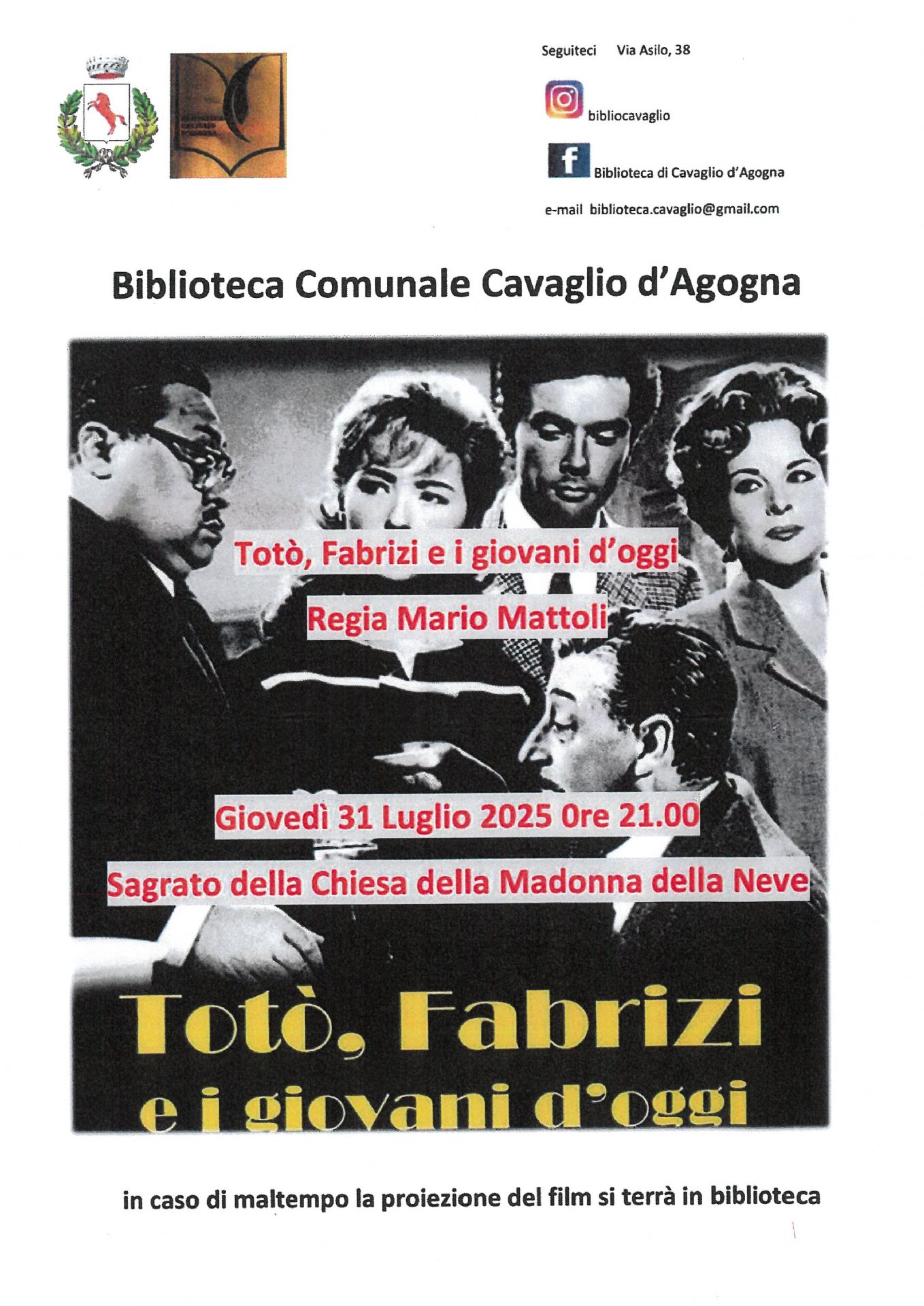 Proiezione film "Toto, Fabrizi e i giovani d'oggi" Giovedì 31 Luglio 2025 alle ore 21 sagrato della Chiesa della Madonna della Neve. In caso di maltempo la protezione del film si terrà' in Biblioteca