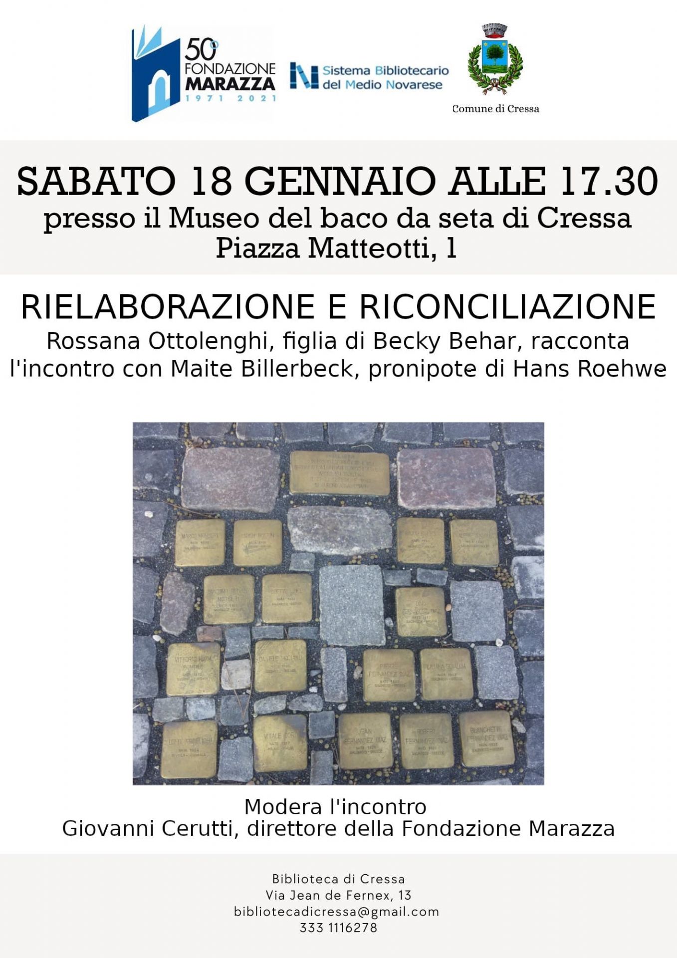 La Biblioteca Comunale di Cressa, con la collaborazione del Sistema Bibliotecario del Medio Novarese e la Fondazione Marazza di Borgomanero, organizza, presso il Museo del Baco da Seta, in occasione della Giornata della Memoria, l'Evento "Rielaborazione e Riconciliazione" , durante il quale Rossana Ottolenghi, figlia di Becky Behar, parlerà del suo incontro con Maite Billerbeck.