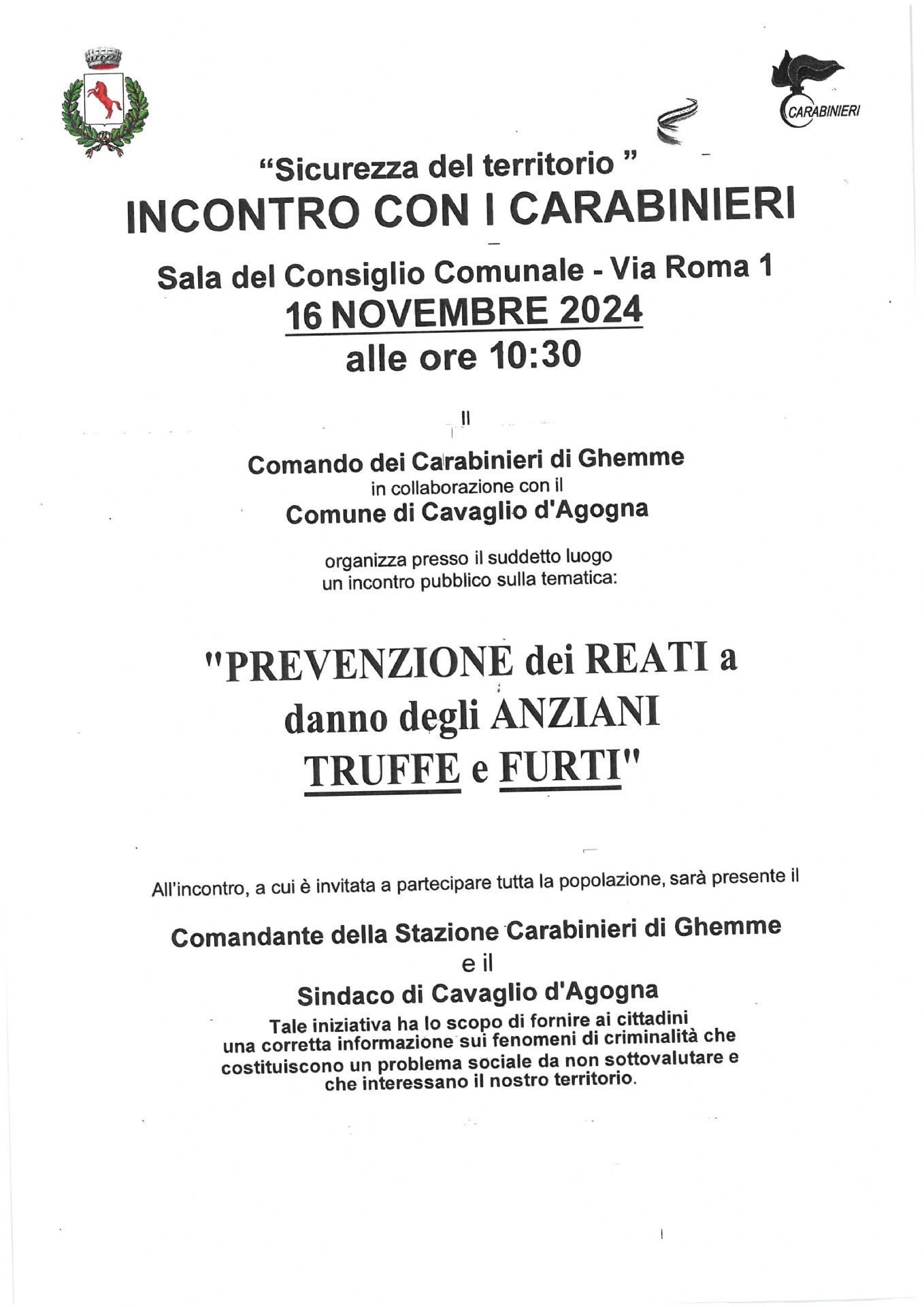 "Sicurezza del territorio" Incontro con i Carabinieri - Sala del Consiglio Comunale - Via Roma n. 1 - 16 Novembre 2024 alle ore 10:30 il Comando dei Carabinieri di Ghemme in collaborazione con il Comune di Cavaglio d'Agogna organizza presso il suddetto luogo un incontro sulla tematica "Prevenzione dei reati a danno degli anziani - Truffe e furti"