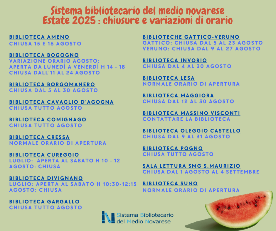 - Orario estivo biblioteche comunali sistema bibliotecario del medio novarese: per Suno, invariato.[.png 206,76 Kb - 21/07/2025]