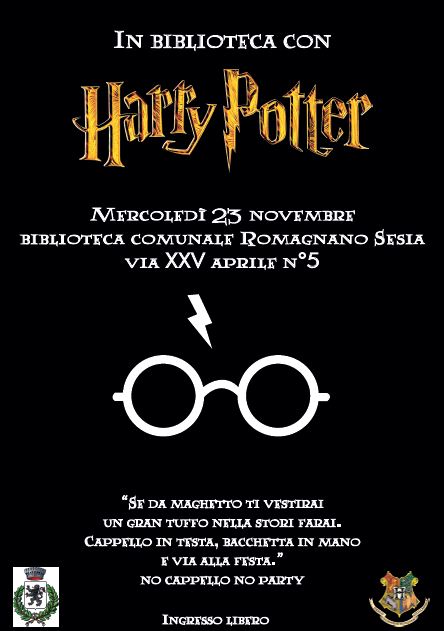 Dopo l’uscita dell’ultimo capitolo la biblioteca di Romagnano Sesia ha deciso di celebrare il giovane mago di Hogwarts. Mercoledì 23 novembre in biblioteca a Romagnano Sesia alle ore 21 si terrà una serata “magica” dedicata a Harry Potter. Una serie di letture animate per bambini, ragazzi. Ingresso libero e si può vestirsi con cappello e bacchetta. Un appuntamento assolutamente da non perdere!