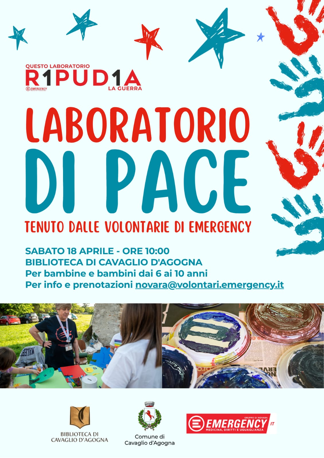 L'Amministrazione Comunale con il Consiglio di Biblioteca invitano tutti i bambini al “laboratorio di pace”, gestito dalle volontarie di Emergency, il giorno sabato 18 aprile alle ore 10.00 presso la Biblioteca Comunale.