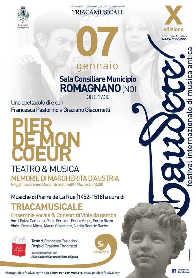 Domenica 7 gennaio, alle ore 17:30, presso la Sala Consigliare del Municipio di Romagnano, andrà in scena lo spettacolo di e con Francesca Pastorino e Graziano Giacometti dal titolo "Pier De Mon Coeur", teatro e musica, memorie di Margherita d'Austria.