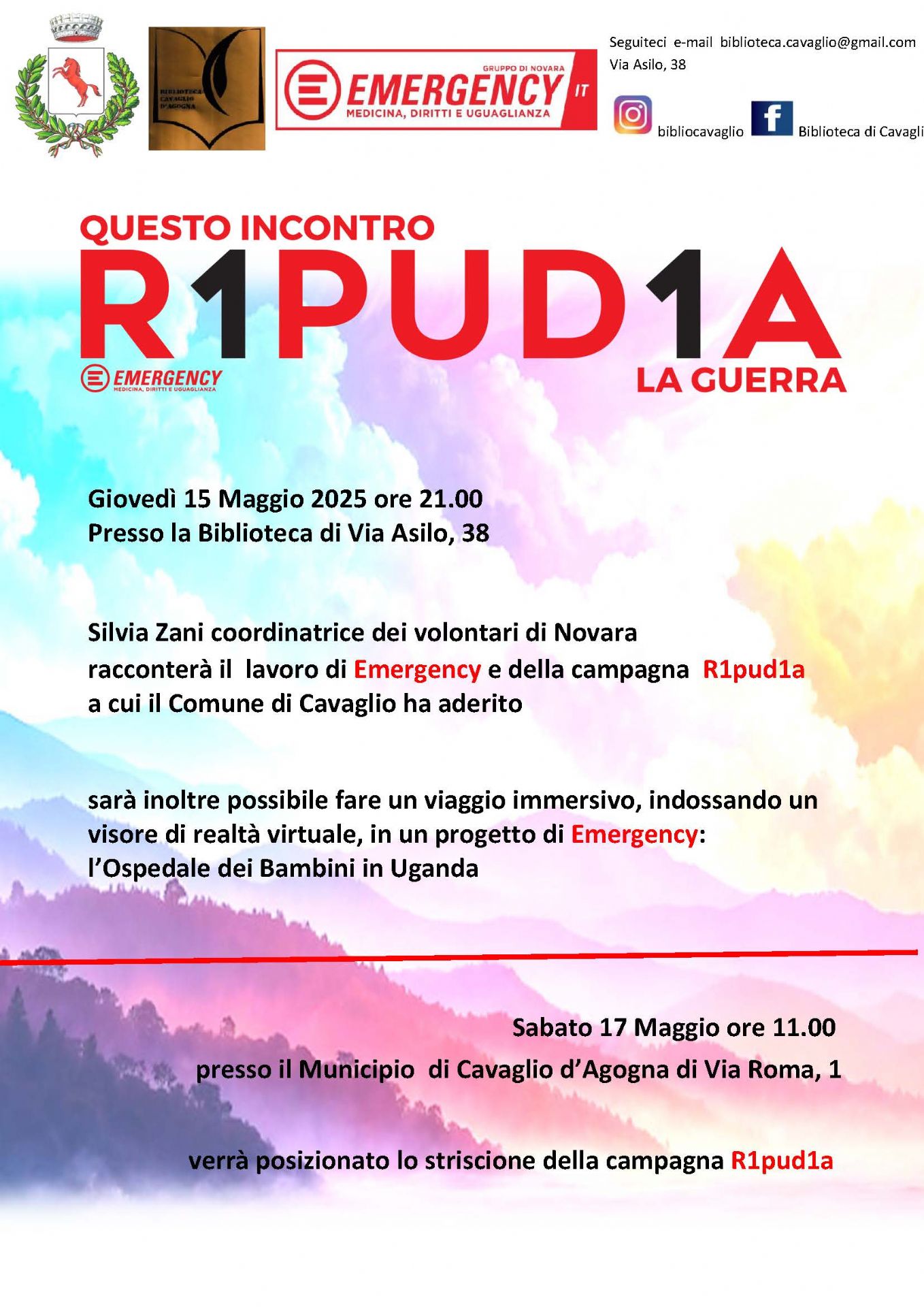 Silvia Zani coordinatrice dei volontari di Novara racconterà il lavoro di Emergency e della campagna R1pud1a, a cui il Comune di Cavaglio ha aderito.