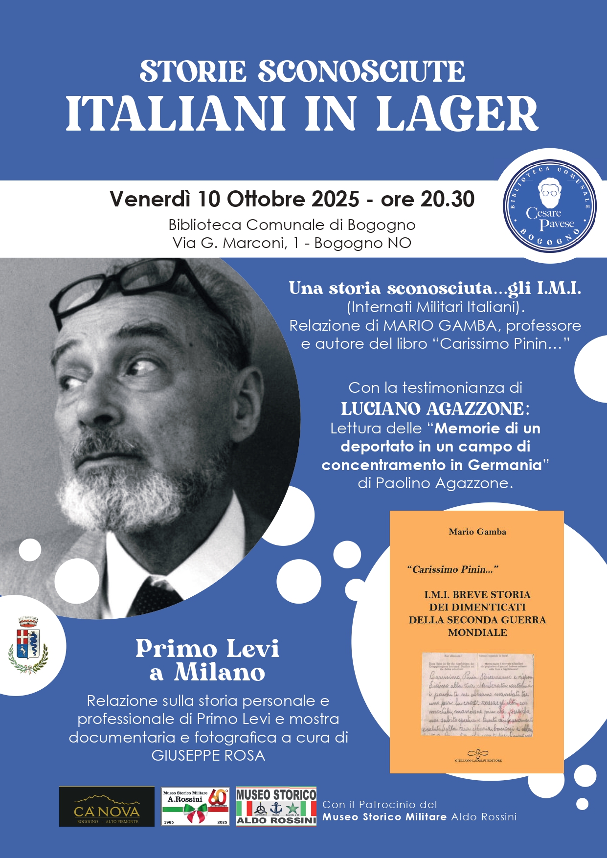 Venerdì 10 ottobre, ore 20.30: conferenza con Giuseppe Rosa, Prof. Mario Gamba e Luciano Agazzone dedicata al tema degli Internati Militari Italiani e a Primo Levi, con una mostra dedicata a quest’ultimo. Serata in collaborazione con Cà Nova e con il patrocinio del Museo storico militare Aldo Rossini di Novara.