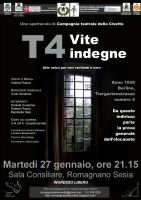 "Il fumo si alza dai forni crematori, muoiono centinaia di migliaia di persone, siamo nella Germania nazista, ma i campi di concentramento ancora non funzionano e allora cos'è? - così Andrea Piazza, autore e regista di "T4. Vite indegne" presenta il nuovo lavoro firmato Compagnia teatrale della Civetta - Il nostro nuovo spettacolo proverà a raccontare la storia, spesso ignorata, di un vero e proprio sterminio diretto contro i disabili e i malati mentali”.