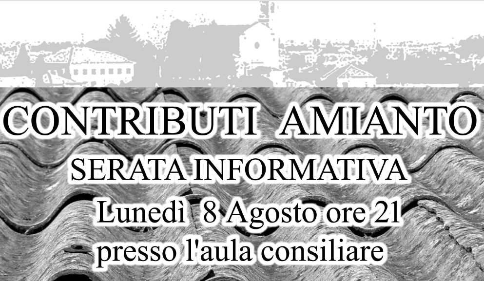 L'amministrazione comunale organizza per lunedì 8 agosto in collaborazione con il Bacino Basso Novarese un incontro pubblico per illustrare alla popolazione le modalità per ottenere i contributi per lo smaltimento di piccole quantità di amianto da parte dei privati cittadini. Sarà presente il Dirigente del Consorzio del Bacino Basso Novarese Francesco Ardizio. Saranno presentate le modalità per ottenere i contributi secondo quanto previsto dal bando Regionale di raccolta, trasporto e smaltimento di piccole quantitativi di manufatti contenenti amianto.