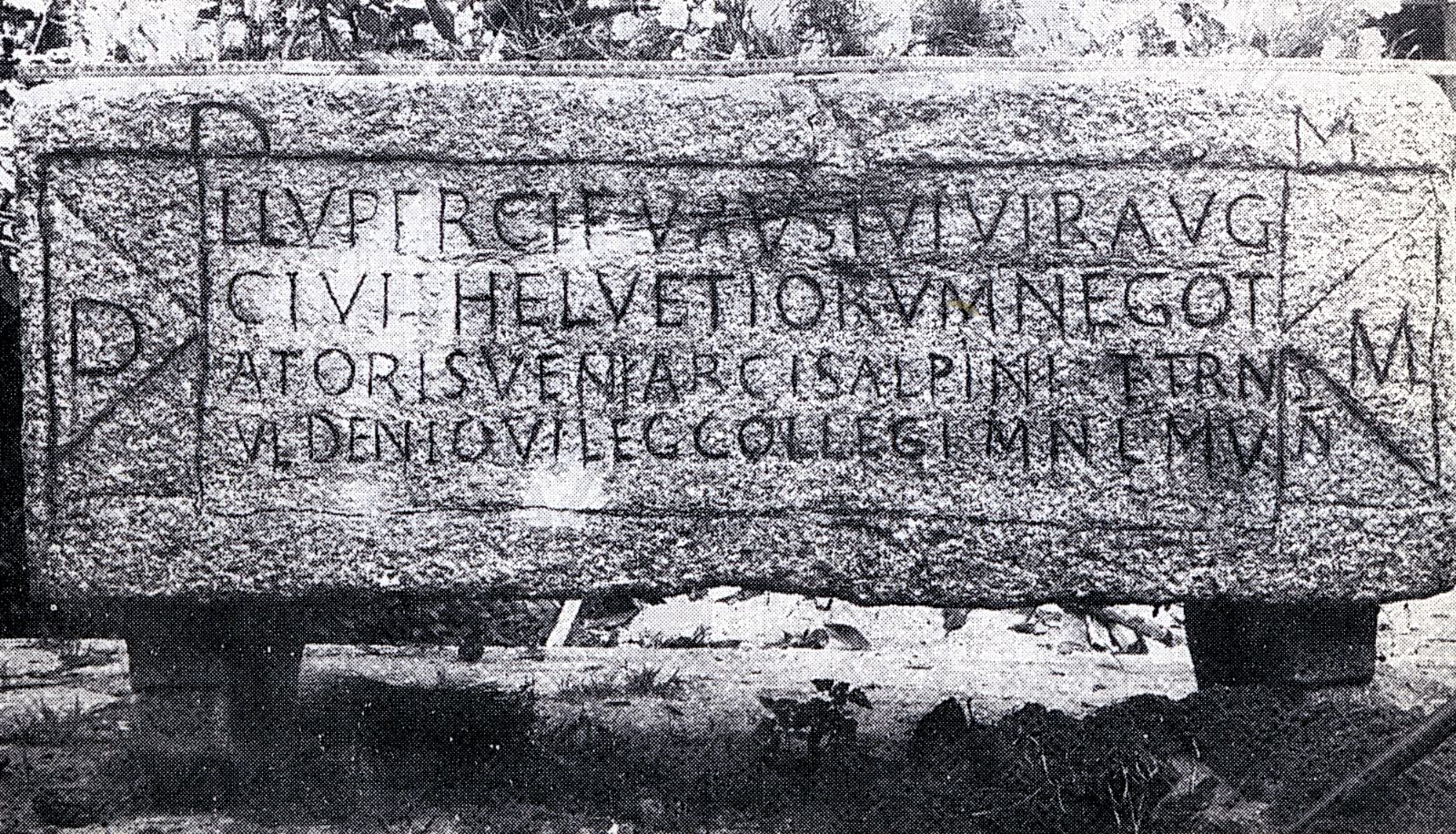 La lettura dell'iscrizione "Civis Helvetiorum Negotiatoris" si può ritenere esatta. L'iscrizione non dice in quale merce egli negoziasse, tuttavia nulla vieta di pensare, data la zona in cui venne trovata l'urna funeraria, che egli sia stato un commerciante di generi agricoli o di vini, in quei tempi tanto apprezzati dai cisalpini.