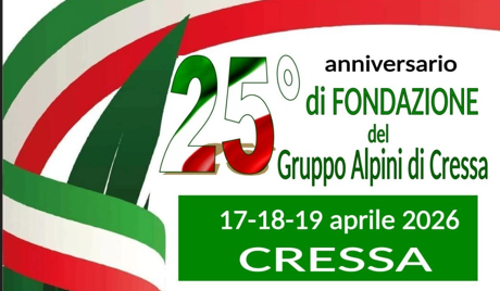 Il Gruppo Alpini di Cressa organizza, in occasione del 25° Anniversario della sua Fondazione, una serie di eventi nelle giornate 17 - 18 - 19 Aprile 2026