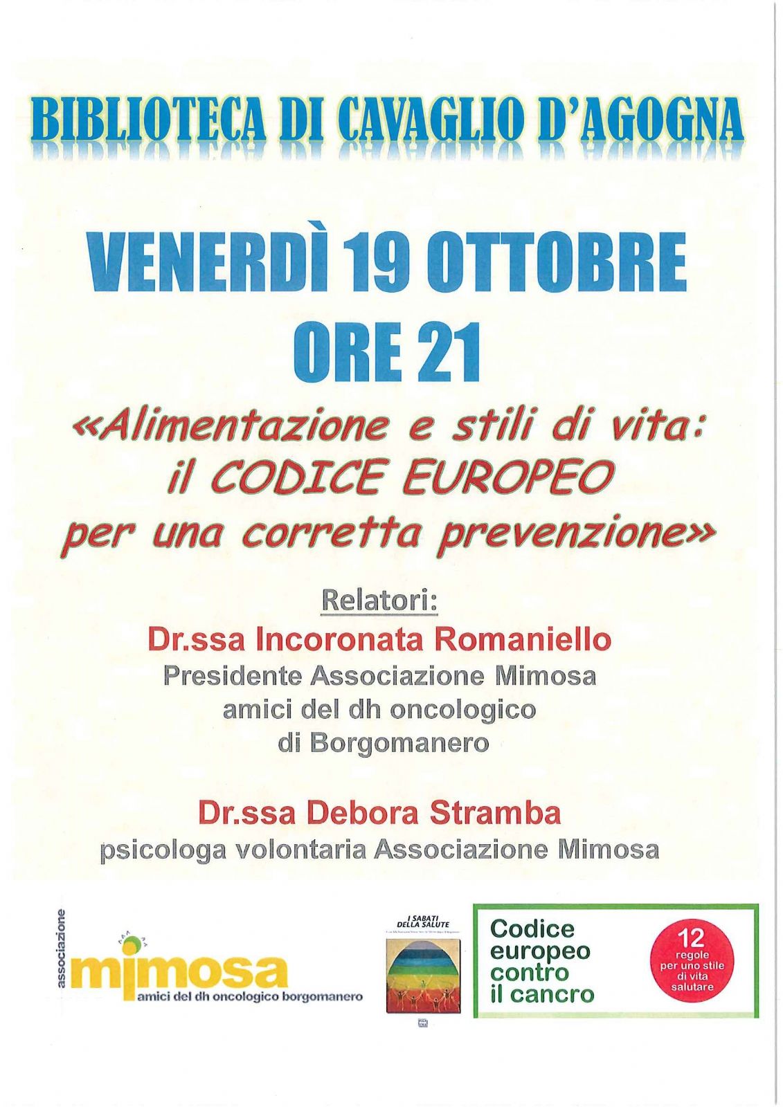 VENERDI' 19 OTTOBRE ALLE ORE 21.00 LA BIBLIOTECA DI CAVAGLIO ORGANIZZA PRESSO LA PROPRIA SEDE IN CAVAGLIO D'AGOGNA UN CONVEGNO DAL TITOLO "ALIMENTAZIONE E STILI DI VITA: IL CODICE EUROPEO PER UNA CORRETTA PREVENZIONE"
