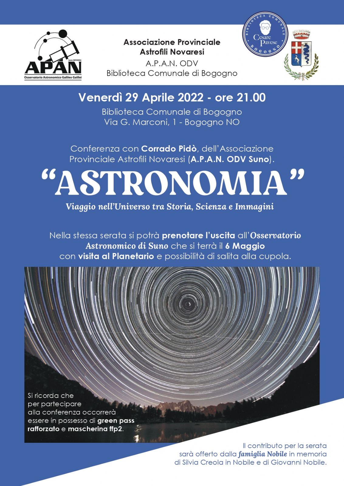 Venerdì 29 Aprile 2022 - ore 21.00 la Biblioteca Comunale di Bogogno organizza la conferenza “ASTRONOMIA”, Viaggio nell’Universo tra Storia, Scienza e Immagini, con Corrado Pidò, dell’Associazione Provinciale Astrofili Novaresi (A.P.A.N. ODV Suno).
