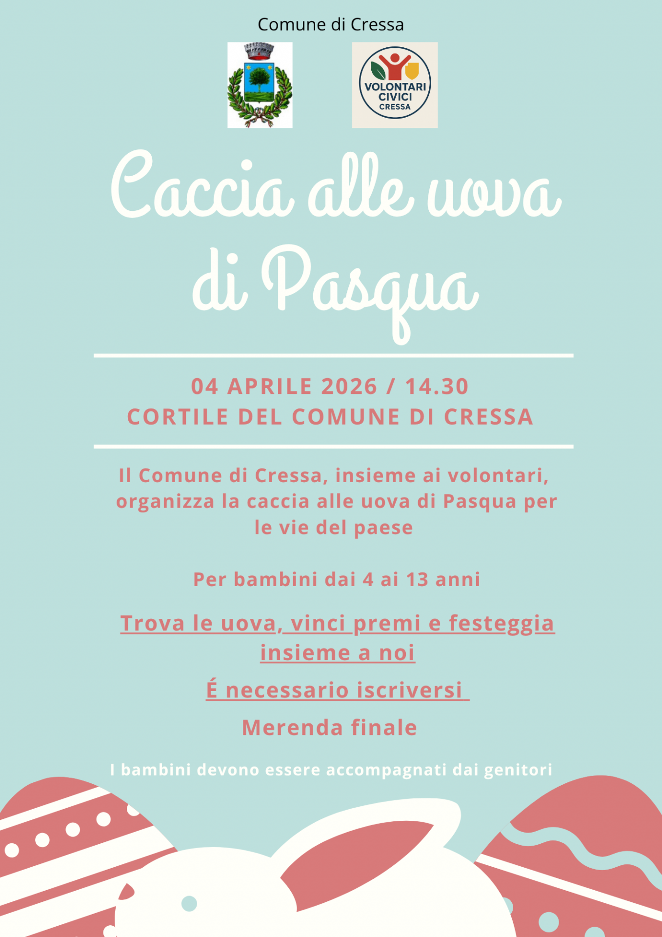 Il Comune di Cressa, con la collaborazione dei Volontari Civici, organizza la Caccia alle Uova di Pasqua per le vie e piazze del Paese dedicato ai Bambini dai 4 ai 13 anni.