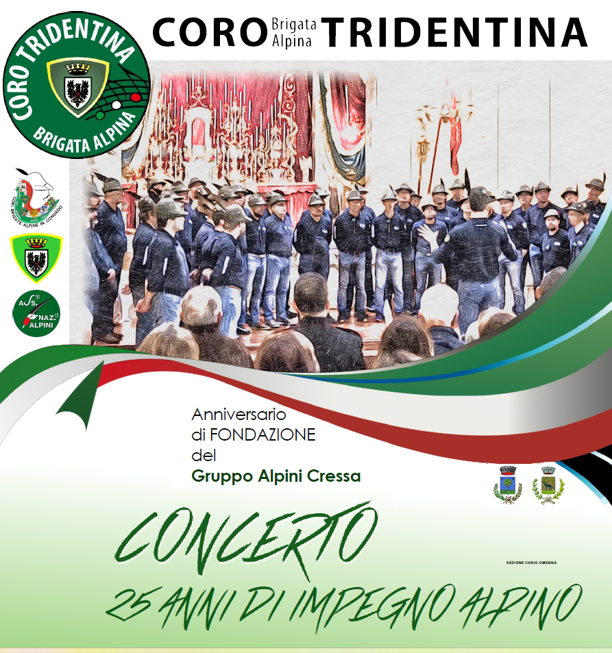 Il Gruppo Alpini di Cressa, nell'ambito dei Festeggiamenti e delle cerimonie per il 25° Anniversario della Fondazione invita la Cittadinanza al concerto della Brigata Alpina TRIDENTINA