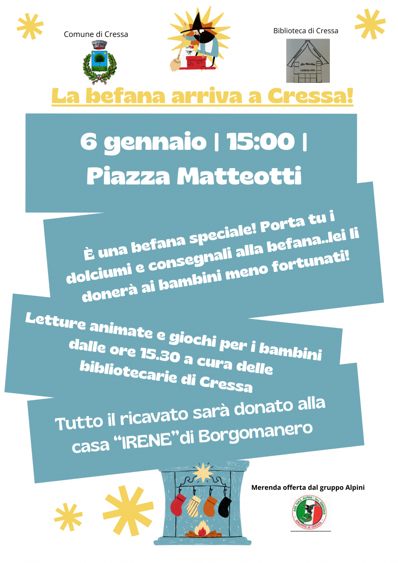 L'Amministrazione Comunale organizza, con la collaborazione della Biblioteca di Cressa e del Gruppo Alpini, per il giorno dell'Epifania - 6 Gennaio 2026 - una raccolta di dolciumi per i Bambini della "Casa Irene" di Borgomanero.